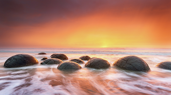 Sunrise at the amazing Moeraki Boulders in New Zealand